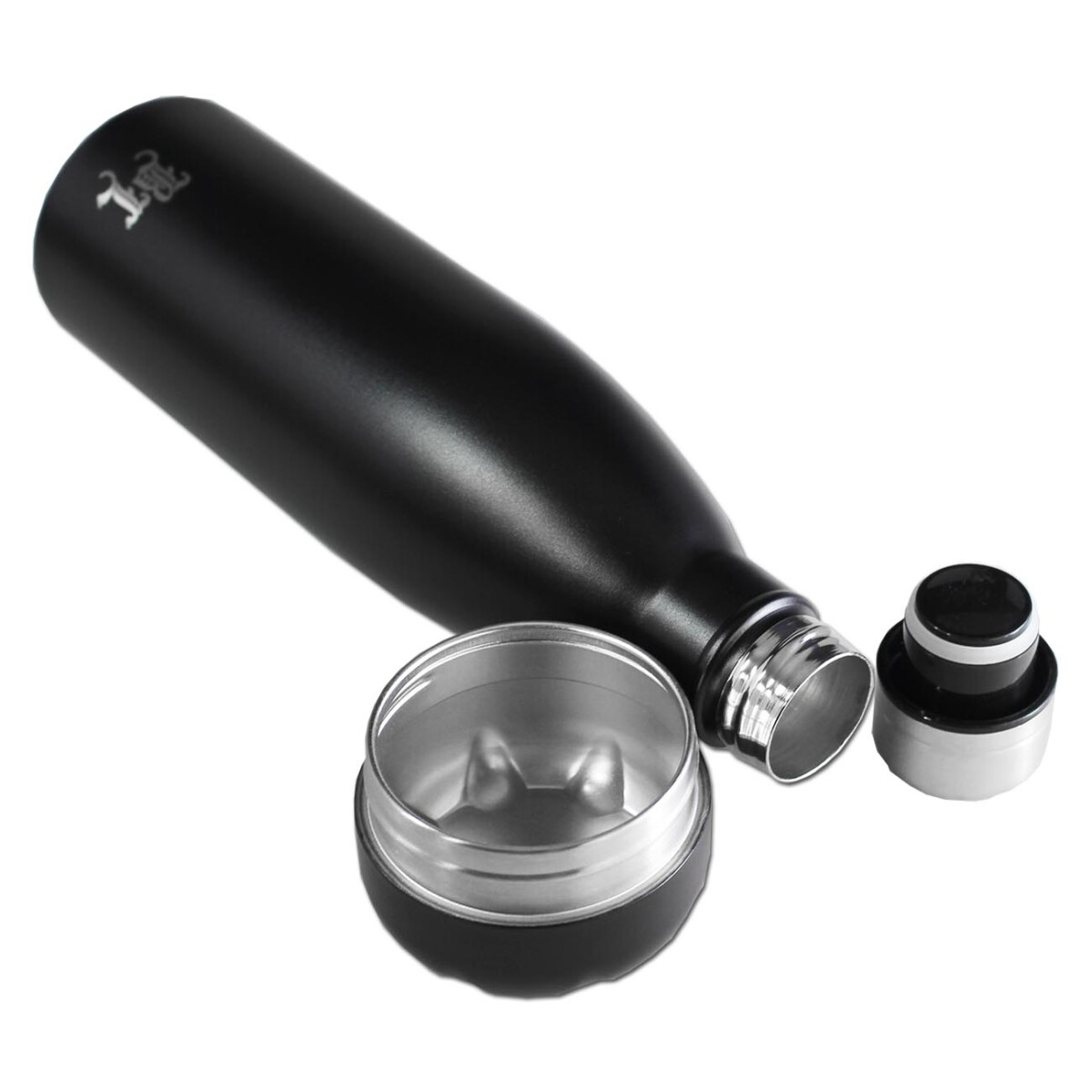 Smart drikkeflaske med hemmeligt rum i bunden (sort). Den ligner en almindelig stålflaske, men fungerer som drikkeflaske / skjuledåse til små værdigenstande. Perfekt til rejse, festival eller hverdagen, når du vil have skjuledåse uden at noget stikker ud. Skruelåg gør den nem at åbne og lukke igen.