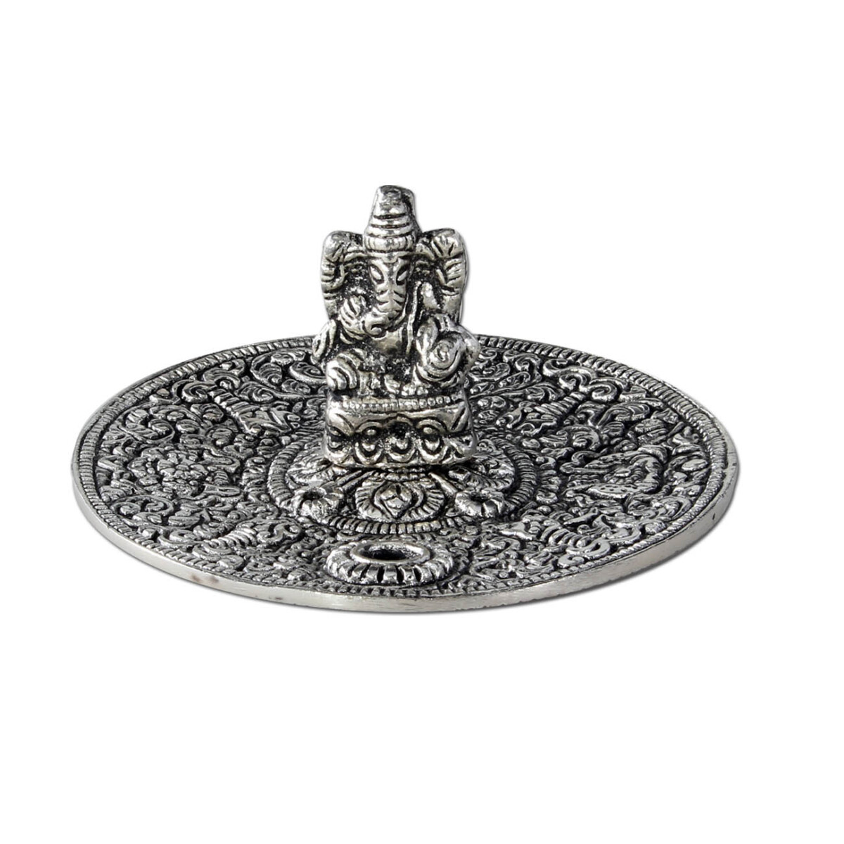 Dekorativ røgelsesholder i varmebestandigt metal med Ganesha-motiv i sølvfarvet finish. Den lodrette stand giver en jævn glød, og asken samles pænt i skålen. Der er plads til 3 røgelsespinde ad gangen – perfekt til et roligt hjørne, altan eller meditationsrum. Husk: lad aldrig tændt røgelse være uden opsyn.